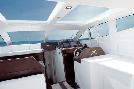 Di fondamentale importanza anche la presenza della porta in acciaio inox e vetro temperato che separa il salone dal pozzetto di poppa esterno in modo da garantire la privacy dei propri ospiti e di rendere l’ambiente più accogliente nei momenti più freddi. Per quanto concerne la suddivisione degli spazi interni viene data molta importanza alle esigenze degli armatori che in questo modo possono personalizzare le proprie imbarcazioni e renderle esemplari unici. Generalmente la compartimentazione interna prevede tre cabine doppie servite da due bagni ed un locale doccia separato e da una cabina singola o a letti a castello posta a centro barca con proprio locale servizio. (E’ possibile inoltre realizzare una cabina Vip nell’estremità di poppa anch’essa con proprio locale servizi e cabina doccia) Il salone, rialzato rispetto al piano delle cabine, è attrezzato per accogliere gli ospiti nel massimo comfort possibile. La particolarità più evidente di questo motoryacht è la presenza dell’hard top elettrico posto sopra il salone che aprendosi rende l’ambiente sottostante a “cielo aperto” regalando luce, aria ed atmosfere emozionanti.