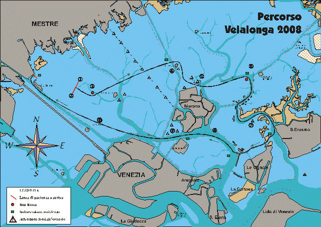 E’ affascinante regatare nell’ambiente della laguna con un percorso che si dipana tra isole, canali, correnti di marea, bassi fondali che mettono a dura prova la capacità dei partecipanti ed esalta il piacere di esserci. Velalonga Venezia è la regata delle piccole barche: derive e simili, tutte con deriva mobile. Le classi previste saranno: Vela al Terzo, Classe 5.50, 10 piedi, Classe A, 470, FJ, Trident, Laser, Open Monoscafi e Open Multiscafi. Questo il percorso dell’edizione 2008.