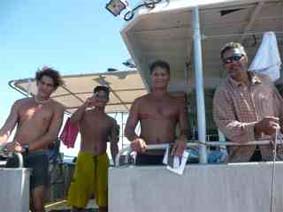 Anche da vicino, però, l’idea era quella di una scatola di fiammiferi: tutta carenata e squadrata, non un bel peschereccio! E così eccomi davanti a facce di esseri umani. E’ stato molto emozionante raccontare tutta la storia fino a qua (chissà cosa avranno capito?). Ho consegnato al capitano 2 cd di foto e video pregandolo di spedirle a Francesca. Per paura che dicesse “Sì, sì ” e poi non lo facesse gli ho addirittura strappato la promessa, ma senza pensare che ci trovavamo in mare!!! Speriamo!!! C’è un però… infatti, se ricordo bene, mi hanno detto di essere per mare da 2 settimane e non sbarcheranno prima di altre 2 quindi i tempi di recapito saranno abbastanza lunghi. Dico fine agosto! Ero molto curioso di guardarli in faccia, questi uomini della Polinesia. Ne sono rimasto un po’ deluso perchè se si esclude uno, quello a sinistra nella foto, che sembra un mohicano con tanto di tatuaggio che gli saliva da una gamba e aveva l’aspetto che ti aspetti – tanti capelli ricci e fini e lineamenti…. direi… un po’ effeminati, gli altri potevano tranquillamente provenire da ogni angolo di mondo tra la Turchia e il Messico. Si sono dimostrati molto gentili e più di una volta mi han chiesto se avessi bisogno di cibo o altro. Bastava che mi facessero quel piacere, per il resto ero contento anche solo averli visti.