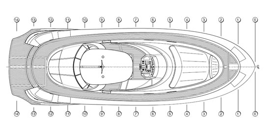 L’assenza di gradini sul piano di coperta, la tuga centrale con hard top mobile interamente in cristallo fumé e verniciata in argento metallizzato cangiante come le murate, il pozzetto ampio e versatile, il posto guida centrale con il cruscotto rivestito in cuoio cucito a mano sono sicuramente elementi molto distintivi. Molto innovativa è la scelta di privare il capo di banda del tientibene, così da lasciare libera la linea dell’imbarcazione da qualsiasi elemento aggiuntivo. Il capo di banda la cui larghezza è tale da diventare una vera e propria seduta aggiuntiva è inoltre un elemento volumetricamente importante che delimita il perimetro della barca con chiarezza.