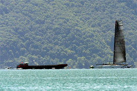 Le condizioni meteorologiche hanno impedito ad Alinghi 5 di uscire in mare per il consueto allenamento, ma i giornalisti presenti hanno comunque avuto modo di ammirare da molto vicino la barca.