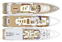 Le aree per il relax all’aperto sono ricavate principalmente a pruavia della timoneria – con un ampia zona prendisole – e, soprattutto, sul sun-deck, perfettamente attrezzato con bar e barbecue, zona pranzo e solarium con jacuzzi di generose dimensioni. Il decor degli interni, di gusto vagamente Art Decò, è caratterizzato dalla cura minuziosa dei dettagli stilistici e, negli ambienti comuni, dal contrasto tra i legni scuri ed il bianco dei tessuti mentre le cabine sono rese più calde dalla presenza di dettagli in pelle come la base e la testiera dei letti.