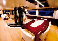 L’ascensore collega fly, salone e ponte inferiore. è avvolto da una scala che ne evidenzia l’estetica grazie all’effetto di trasparenze dei gradini e della cabina di cristallo, in contrasto con la struttura di acciaio.
