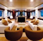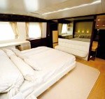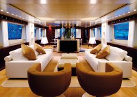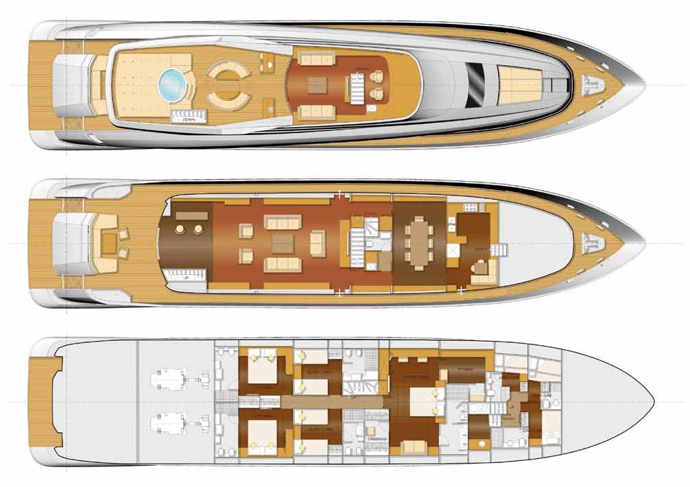 Gli interni dei tre ponti sono giocati su nuance di colori caldi tra mogano lucido ed opaco, pannellature rivestite in pelle, tessuti pregiati e pavimenti in rovere. Dimensioni eccezionali e simmetria degli arredi caratterizzano il salone, separato verso prua dalla zona pranzo da un decorativo ascensore; procedendo si accede alla cucina in corian bianco ed elementi in acciaio, pratica e funzionale dotata di portavivande per servire il fly.