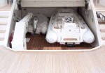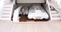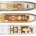 Il profilo dell’Amer 116’ è caratterizzato da una potenza che corre filante dalla spiaggetta lungo tutta la fiancata fino a prora; inoltre lega esteticamente i due ponti e protegge i camminamenti laterali, chiudendo morbidamente sul pozzetto. A poppa si accede esternamente al fly, di dimensioni generose, dove può essere alloggiata una vasca idromassaggio. Dalla piattaforma bagno si apre un capiente garage rivestito in teak che ospita i tender di bordo.