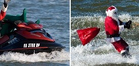 A jet skier dressed as the Grinch waves during a performance highlighted by a water skiing Santa Claus on the Potomac River at National Harbor in Prince George’s County, Maryland, near Washington, DC, on December 24, 2009. Joined by flying elves, Frosty the Snowman in a dinghy and kneeboarding reindeer, Santa celebrates his 24th anniversary of water-skiing in the Washington area on Christmas Eve. AFP PHOTO / Saul LOEB (Photo credit should read SAUL LOEB/AFP/Getty Images)