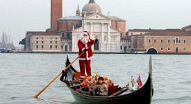 VENICE, Italy: Venice’s gondolier Paolo Agostino dressed as Santa Claus crosses the famous Italian lagoon in front of the San Giorgio Maggiore island, 02 December 2005 in venice. AFP PHOTO / MANUEL SILVESTRI (Photo credit should read MANUEL SILVESTRI/AFP/Getty Images)