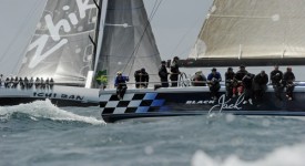 In this photo taken on December 26, 2012 yachts Ichi Ban (L) and Black Jack (R) sail into open water shortly after the start of the Sydney to Hobart yacht race. Wild Oats XI leads the fleet in the annual 628-nautical mile bluewater classic, as the leaders prepared to enter the treacherous Bass Strait towards Tasmania on December 27. IMAGE STRICTLY RESTRICTED TO EDITORIAL USE – STRICTLY NO COMMERCIAL USE AFP PHOTO / Greg WOOD (Photo credit should read GREG WOOD/AFP/Getty Images)