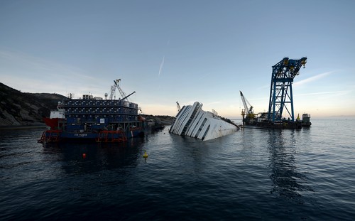 The Costa Concordia cruise ship (R) lays aground near the harbour on January 7, 2013 on the Italian island of Giglio. Works are going ahead as almost a year ago, on January 13, 2012, the giant Italian cruise ship Costa Concordia ran aground near a Tuscan island and pitched leaving 32 people dead. AFP PHOTO / FILIPPO MONTEFORTE (Photo credit should read FILIPPO MONTEFORTE/AFP/Getty Images)