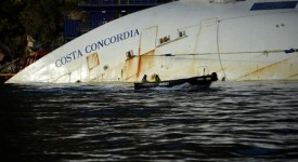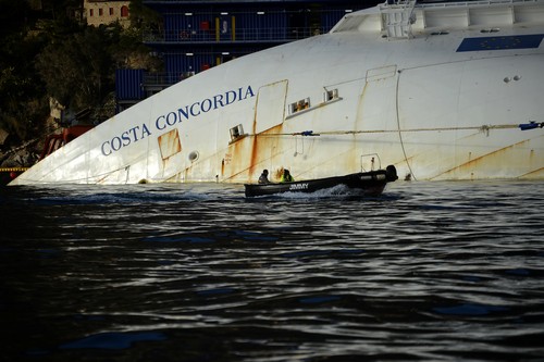 The Costa Concordia cruise ship lays aground near the port on January 8, 2013 on the Italian island of Giglio. Works are going ahead after almost a year ago, on January 13, 2012, the giant Italian cruise ship Costa Concordia ran aground near a Tuscan island and pitched leaving 32 people dead. AFP PHOTO / FILIPPO MONTEFORTE (Photo credit should read FILIPPO MONTEFORTE/AFP/Getty Images)