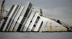 The Costa Concordia cruise ship lays aground near the port on January 9, 2013 on the Italian island of Giglio. A year on from the Costa Concordia tragedy in which 32 people lost their lives, the giant cruise ship still lies keeled over on an Italian island and its captain Francesco Schettino has become a global figure of mockery. AFP PHOTO / FILIPPO MONTEFORTE (Photo credit should read FILIPPO MONTEFORTE/AFP/Getty Images)