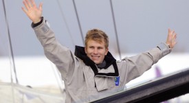 (FILES) – A file picture taken on November 10, 2012 shows French skipper Francois Gabart waving as he takes the start of the 7th Vendee Globe solo non-stop round-the-world yacht race in Les Sables d’Olonne, western France. Gabart is leading the race on December 23, 2012. AFP PHOTO / DAMIEN MEYER (Photo credit should read DAMIEN MEYER/AFP/Getty Images)
