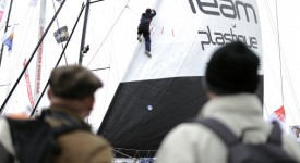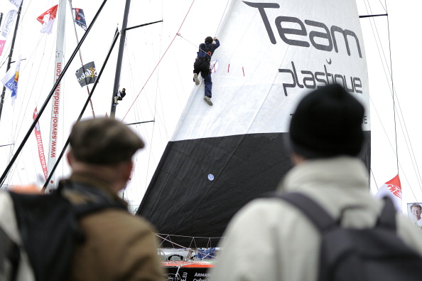 Italian skipper Alessandro di Benedetto’s teammate works on the monohull “Team Plastique”, on November 9, 2012 in Les Sables d’Olonne, western France. The 7th edition of the Vendee Globe solo round-the-world race will start on November 10, 2012. AFP PHOTO JEAN-SEBASTIEN EVRARD (Photo credit should read JEAN-SEBASTIEN EVRARD/AFP/Getty Images)