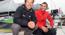 Italian skipper Alessandro Benedetto of the monohull “Team Plastique” (R) poses with French skipper Thomas Coville one day before the start of the Vendee Globe race, on November 9, 2012, in the harbour of Les Sables d’Olonne, western France. The 7th edition of the Vendee Globe solo round-the-world race will start on November 10, 2012. AFP PHOTO / FRED TANNEAU (Photo credit should read FRED TANNEAU/AFP/Getty Images)