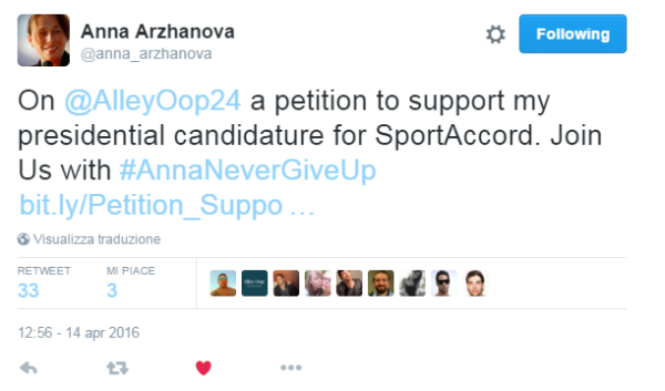 Dal desiderio di portare una donna, per la prima volta nella sua storia, al vertice di un organismo internazionale di alto livello quale SportAccord è, è stata ideata da parte delle protagoniste dell’universo sportivo una campagna a sostegno della Arzhanova. Lanciata su tutti i social con l’Hashtag #AnnaNeverGiveUp, aderirvi è semplice. Basta sottoscrivere la relativa petizione compilando il form con i pochi dati richiesti.