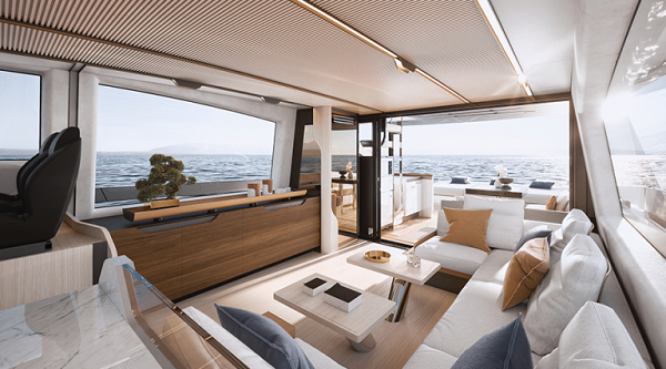 Il pozzetto sopra e la plancetta poppiera appaiono essere molto funzionali per vivere con comodità questa imbarcazione. Anche il fly prevede degli spazi conviviali importanti. Insomma si parla di uno yacht costruito internamente ed esternamente per essere vissuto appieno.