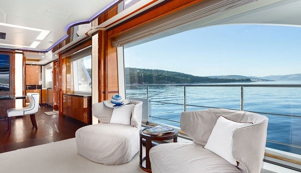 I toni che risaltano maggiormente sono forniti dagli arredi color chiaro e le superfici laccate di legno frammiste a onice. Basta solo questo per capire che si parla di un superyacht dove l’intento è quello di mettere a disposizione eleganza ma anche semplicità. Gli interni chiari collaborano, insieme alle ampie vetrate, a dare un senso di libertà semplice ma di effetto. E i suoi volumi, essenzialmente, consentono di dare ampio spazio a parenti e amici dell’armatore.