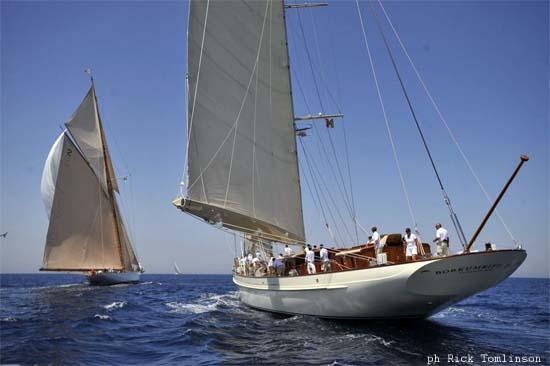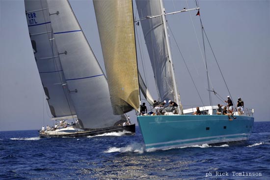 Il caldo vento di levante che l’alta pressione ha generato, oggi non ha superato i 15 nodi di velocità; eppure, i ventitré maxi yacht che partecipano alla Boat International Superyacht Regatta hanno navigato con incedere veloce. Nulla di strano se si pensa che la loro superficie velica è immensa e direttamente proporzionale alla dimensione degli scafi, che da un minimo di 24 metri arrivano a 52: quelli austeri e filanti del gigante australiano Kokomo.