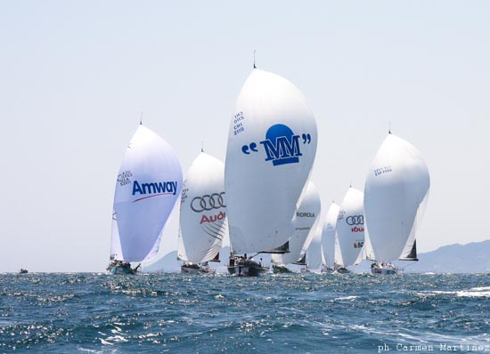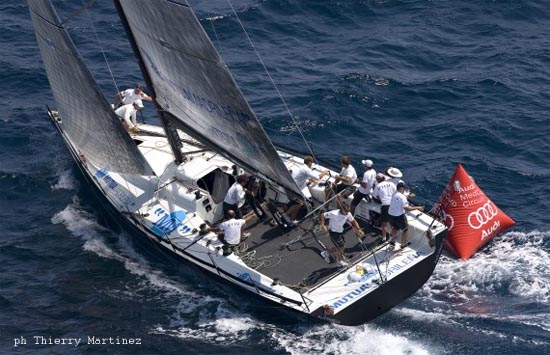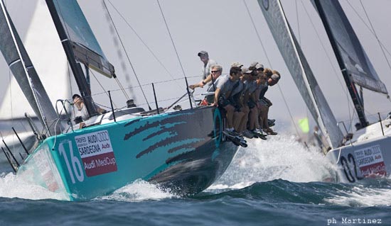 Dopo la sospensione della prima procedura di partenza, causa l’instabilità del vento, alle 13:28 il Comitato di Regata ha potuto dare nuovamente la partenza della sesta prova, la regata costiera del Trofeo Audi Regione Autonoma della Sardegna. La prima parte è stata un bastone (bolina – poppa) della lunghezza di 6 miglia con un vento di 7 nodi di intensità. La parte sinistra è risultata essere nettamente la favorita e la grande separazione laterale ha fatto si che, alla prima boa, la distanza con quelli che erano andati a destra fosse importante.
