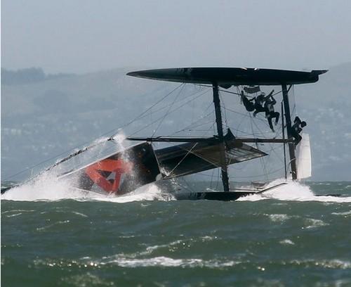 E non parliamo di un team qualsiasi o misconosciuto, ma del detentore del titolo 2010 Oracle. Uno dei due equipaggi, quello del team AC45 condotto dallo skipper James Spithill si è ribaltato nella baia di San Francisco all’altezza di Golden Gate Bridge durante una regata “promozionale” per la presentazione dell’America’s Cup 2013. Mentre i 2 team regatavano verso il Yacht Club Golden Gate una folata di vento forte è stata sufficiente a far capovolgere il catamarano.