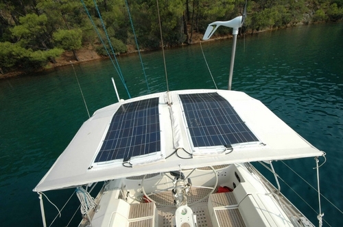 L’utilizzo sopra il tendalino è possibile grazie a un substrato flessibile prodotto dalla Enecom Srl, azienda torinese specializzata in energie eco compatibili. Enecom produce moduli flessibili di diverse grandezze e potenze impiegando celle di silicio cristallino ad elevata efficienza. Nel caso del bimini della BGV vengono impiegati materiali curvabili, infrangibili, resistenti, impermeabili e leggeri.