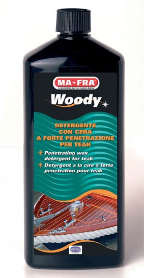 WOODY è il nuovo prodotto professionale concentrato, con tensioattivi di origine vegetale, studiato nei laboratori di Ricerca e Sviluppo MA-FRA per il mantenimento e la rigenerazione delle parti in teak delle imbarcazioni. WOODY è un prodotto “due in uno”. PURO, infatti, permette di eseguire operazioni di pulizia straordinaria: la sua formula, con tensioattivi naturali ad elevato potere penetrante, deterge in profondità il legno sollevando e disgregando lo sporco, rimuovendo macchie nere, impurità e ogni traccia di muffa e alghe, ripristinando le condizioni originarie del materiale senza necessità di laminare o carteggiare la superficie. Diluito, secondo gli schemi suggeriti, è adatto al lavaggio periodico del legno in normali condizioni: la cera impermeabilizzante, contenuta nella formulazione, sigilla le venature aperte e mantiene il legno facendone risaltare l’originale bellezza. WOODY può essere diluito anche con acqua di mare.