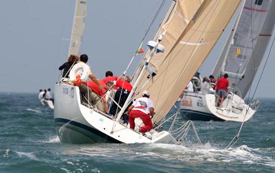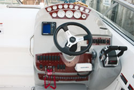 Una linea pregevole con murate alte, masconi pieni e una ruota di prua di ampio raggio, ecco in sintesi, l’immagine di questo nuovo express-cruiser di scuola americana.Saliti a bordo notiamo come l’assenza di passavanti e la larghezza della tuga, raggiungibile attraverso l’apertura centrale del parabrezza tramite gradini ricavati sul portello d’accesso alla cabina, consentano di fruire di un pozzetto ampio e ben protetto dal prolungamento dello stesso parabrezza che corre fino a tre quarti barca.La console di guida, ben posizionata sulla dritta, ha un design sportivo e può contare su una plancia di stile automobilistico dove tutta la strumentazione oltre ad essere visibile risulta facilmente raggiungibile. Dietro alla doppia seduta del pilota, girevole, in modo da creare un’area living con l‘ausilio del divano antistante, si sviluppa l’area conviviale, composta da un divano a murata a forma di L, servito da un tavolino triangolare a piantana, a cui fa riscontro sul lato opposto un mobile attrezzato con lavello e sottostante frigorifero.