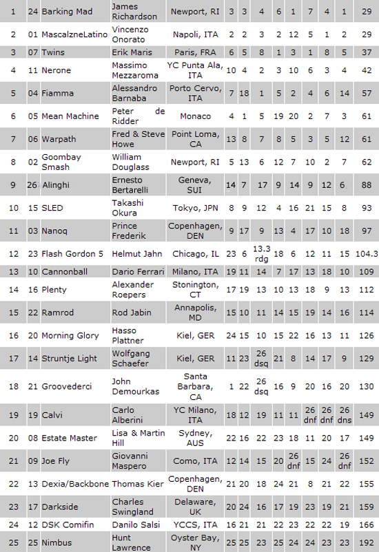 Due giorni di competizioni nei quali si sono corse 6 prove come da programma; Venerdì l’equipaggio di Vincenzo Onorato aveva terminato in 13° posizione in classifica provvisoria, posizionandosi 18°, 13° e 10° rispettivamente nelle tre prove disputate. Nella seconda ed ultima giornata, sabato, i Mascalzoni hanno ottenuto un 15°, un 1° e un 12°, conquistando così 69 punti totali.