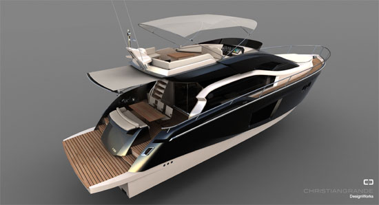 La modellazione degli esterni è sviluppata omogeneamente su tutta la figura della barca, con forme muscolose e raccordate a renderla spiccatamente sportiva. Tre grandi cabine e tre ambienti living-cucina, strutturati e rivisti in chiave
