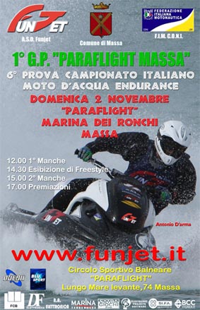 A.S.D. Funjet di Empoli, in collaborazione con lo staff organizzativo “PARAFLIGHT” di Massa ed il Comune di Massa, è lieta di presentare l’ultimo importante impegno agonistico della lunga stagione 2008, con l’organizzazione del 1° G.P. “PARAFLIGHT MASSA” 6° e ultima prova di Campionato Italiano Moto D’acqua Endurance 2008. Le gare si terranno Domenica 2 Novembre nello specchio di mare compreso tra il Circolo Sportivo Balneare “Paraflight” sito in lungomare Levante a Ronchi e il pontile di Marina di Massa. Sarà sicuramente una gara molto emozionante, che vedrà i piloti, provenienti da tutta Italia affrontarsi in una prova di resistenza molto impegnativa, che prevede 2 manche di 45 minuti ciascuna. Non mancheranno le dimostrazioni di Moto D’Acqua Freestyle con la presenza del Campione Italiano Freestyle Pro 2008 Valerio Calderoni.