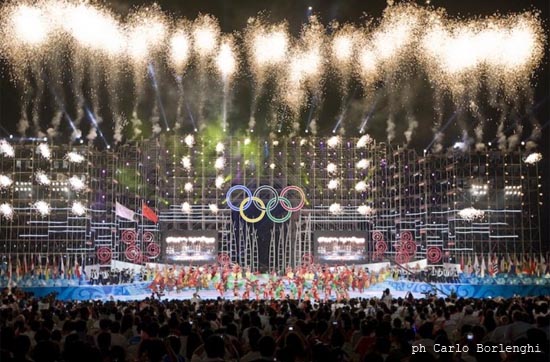 Emozionante, lunga, coreografica e coloratissima: più di 90mila spettatori hanno assistito alla Cerimonia d’apertura al National Stadium di Pechino. Sono serviti 15 mila attori per realizzare uno spettacolo davvero emozionante dove tradizione e modernità si sono uniti in perfetta simbiosi. Percussioni e fuochi d’artificio hanno fatto il resto. La Squadra italiana, guidata dal Capo Missione Raffaele Pagnozzi, con in testa il portabandiera Antonio Rossi, è stata la 191 a sfilare secondo l’ordine alfabetico cinese. Con l’accensione della fiamma olimpica e la dichiarazione di apertura ha preso quindi il via la 29° edizione dei Giochi Olimpici.