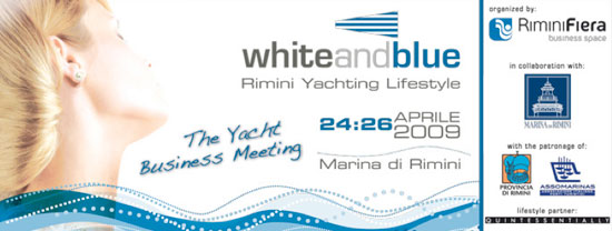 Rimini Fiera, uno dei principali player del mercato fieristico italiano ed internazionale con un portafoglio di 40 manifestazioni, lancia la prima edizione di White and Blue. Rimini Yachting Lifestyle, un innovativo evento dedicato alla nautica e al mondo del lusso in programma, con il patrocinio di Assomarinas – Associazione Italiana Porti Turistici – Provincia e Comune di Rimini dal 24 al 26 aprile 2009 presso la Marina Blu di Rimini (www.marinadirimini.com ).