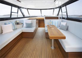 Costruito con cura, bello ed equilibrato. Così può essere descritto l’F46, un’imbarcazione il cui styling abbina felicemente classe e modernità. Le sue soluzioni avveniristiche e le tecnologie applicate garantiscono magnifiche performance dinamiche, per viaggi in assoluta souplesse. Come gli ultimi modelli presentati da Sealine (T60 Aura, SC47 e SC35) questo flybridge è stato concepito per sfruttare al massimo la luce naturale. Dal pozzetto alla zona living, ogni area della barca è collegata senza soluzione di continuità, per usufruire al massimo degli spazi e della luce creando un’unica zona dedicata al relax e capace di ospitare l’armatore e i suoi ospiti.